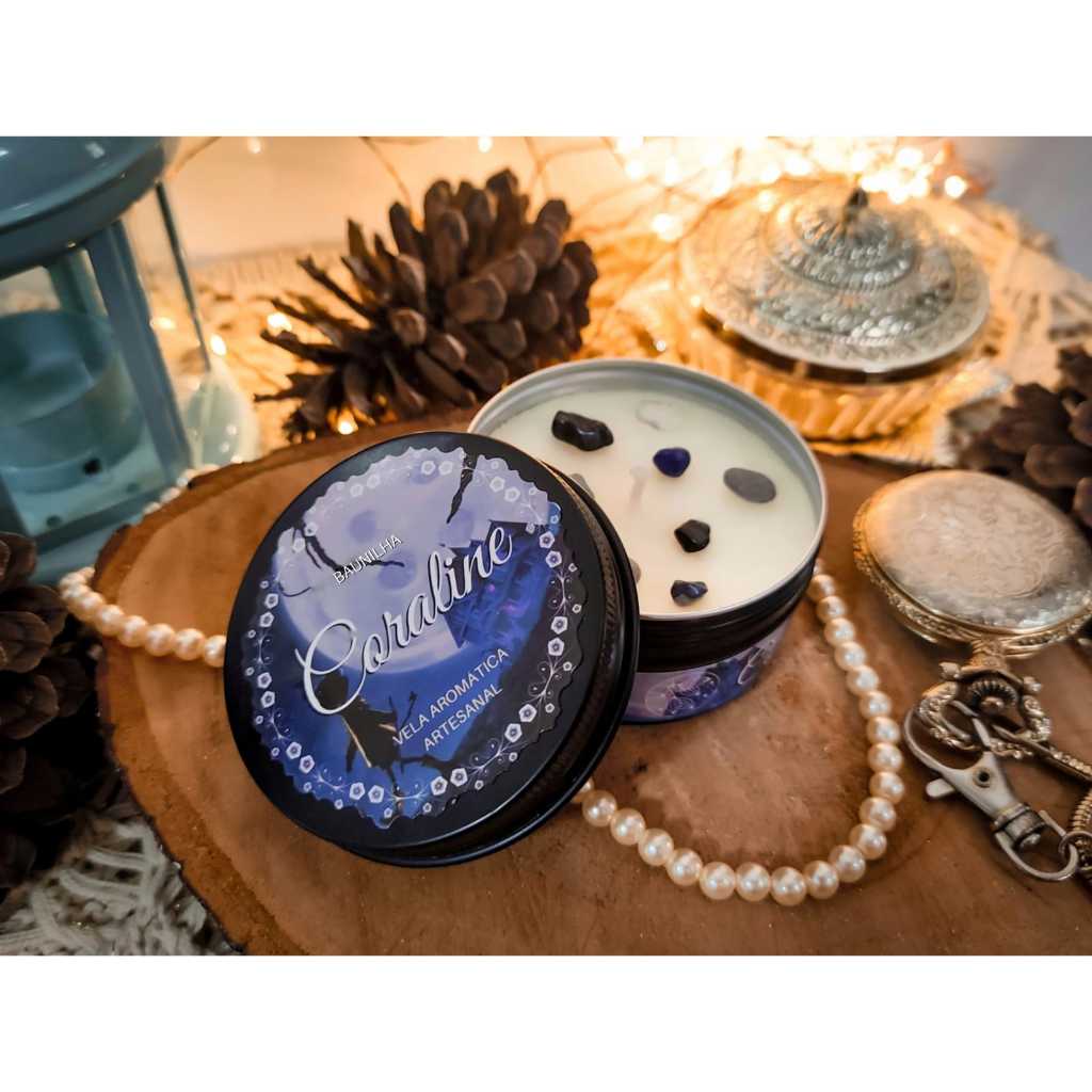 Vela Aromática | Coraline | Lata | Baunilha | Literária | Livros | Cera Vegetal | Cristais