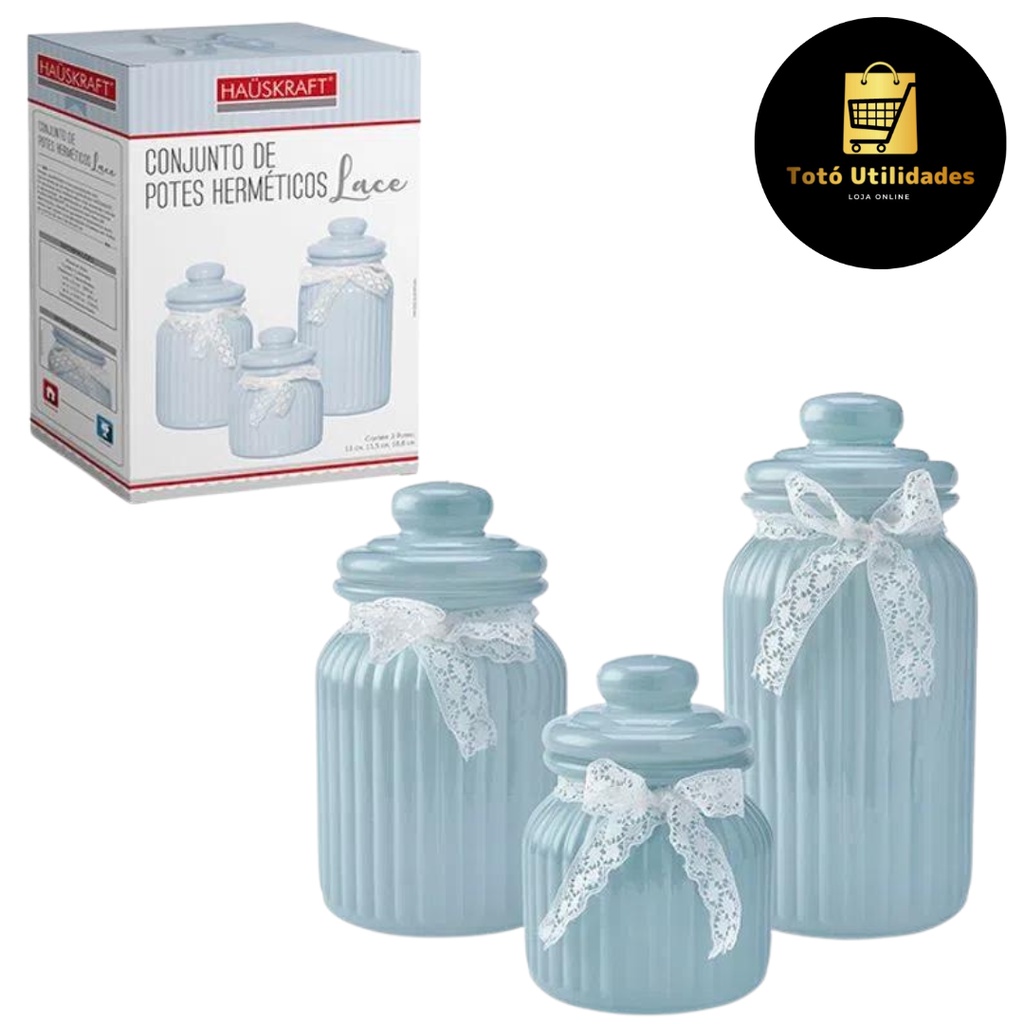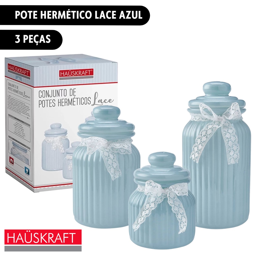 Conjunto com 3 Potes Herméticos Lace Azul Hauskraft