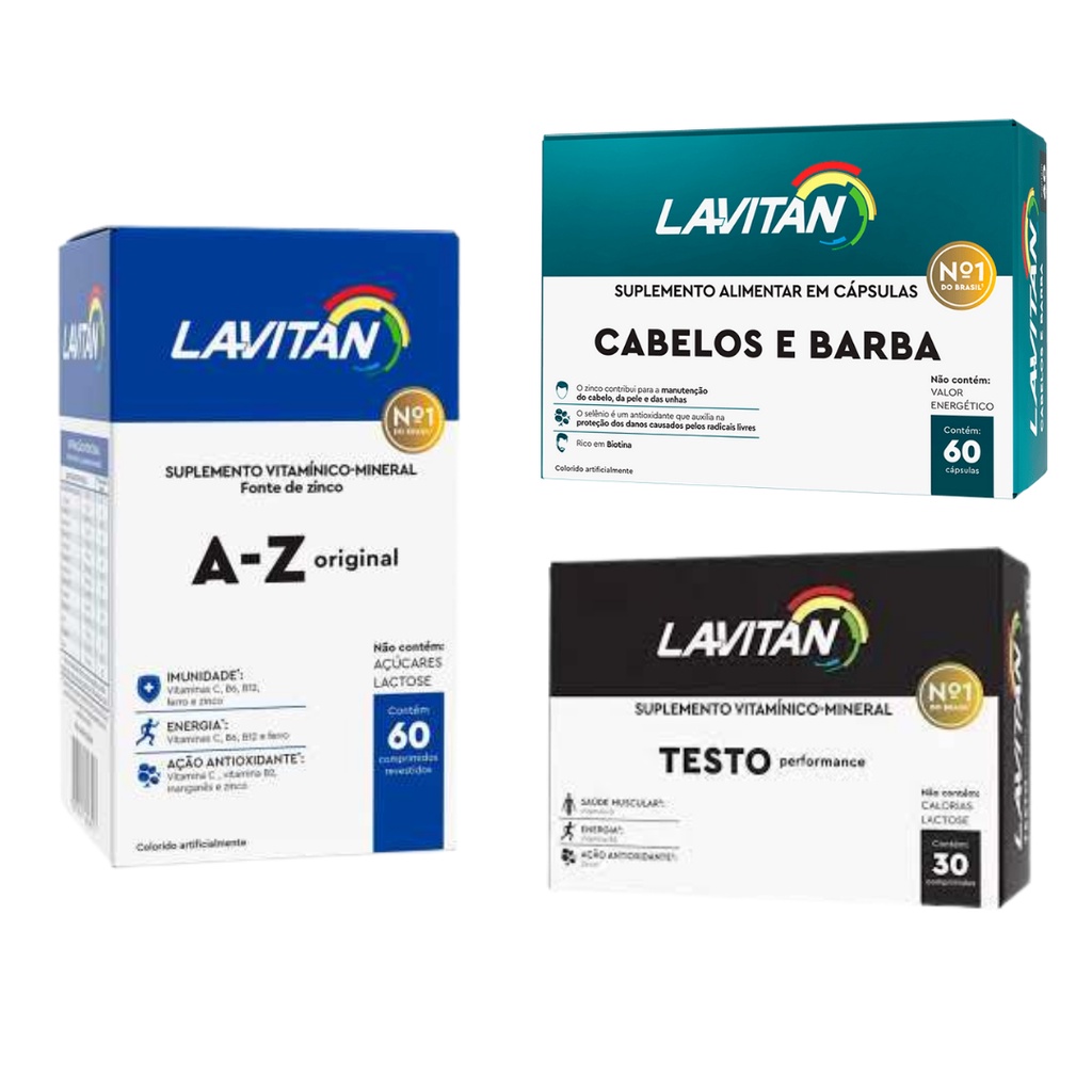 Lavitan AZ homem c/ 60 cáps + Lavitan Cabelos e Barba c/ 60 cáps + Lavitan Testo Performance 30 cáps. Cimed