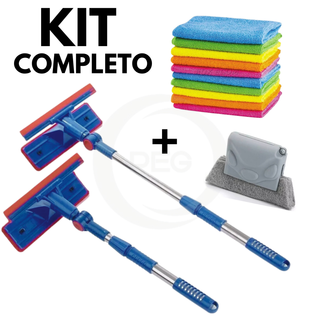 KIT Rodo Limpa Vidro + 5 Panos Microfibra + Escova Limpeza Trilho Janela 2 em 1 Com Esponja Multiuso