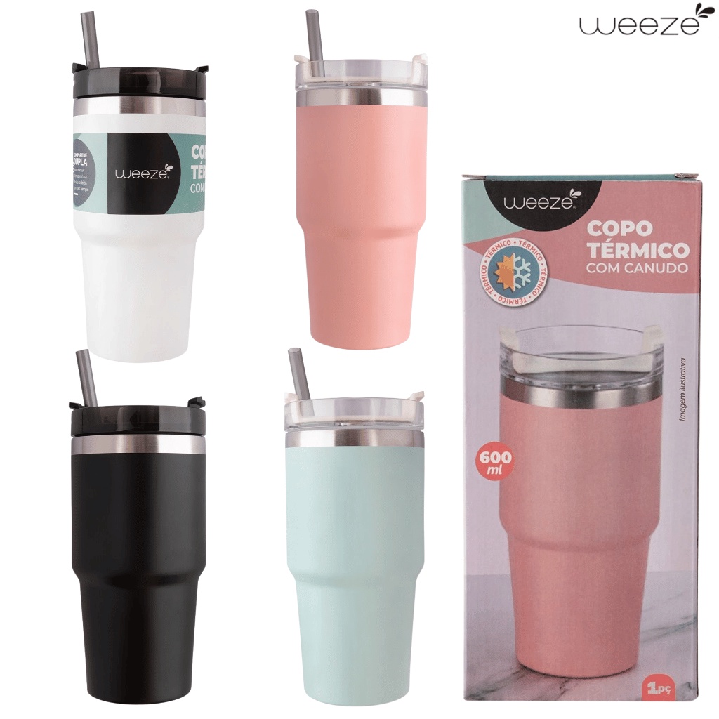 Copo Térmico Aço Inox 600ml Tampa Canudo Ideal para Café Chá Cerveja Água Sucos Bebidas Geladas ou Quentes