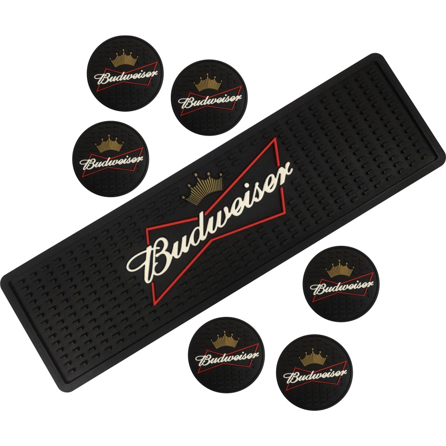 Tapete Barmat Bud 50x15 + 6 Porta Copos Service Mat Tapete Escorredor Para Mesa Bar Balcao Suor Chopp Whisky Cerveja