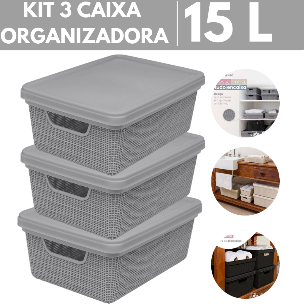 Kit Com 3 Caixa Organizadora com Tampa Grande de Plástico 15 Litros Jaguar