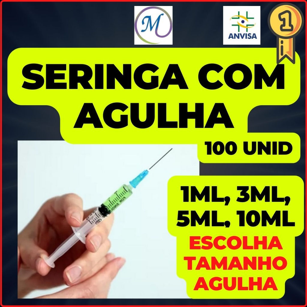 Seringa Descartável 1ML, 3ML, 5ML, 10ML Luer Slip com Agulha Descartável 13X4,5, 20X5,5, 25X7, 25X8, 30X7, 30X8, 40X12 - 100 seringas + 100 agulhas