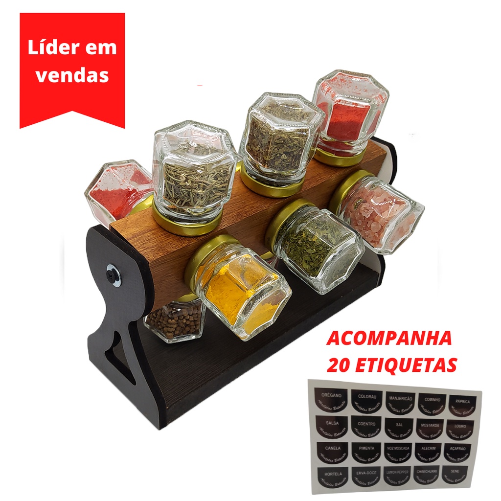 Porta Condimentos e Temperos Cozinha Giratório - Suporte com 6 Potes de Vidro + Suporte