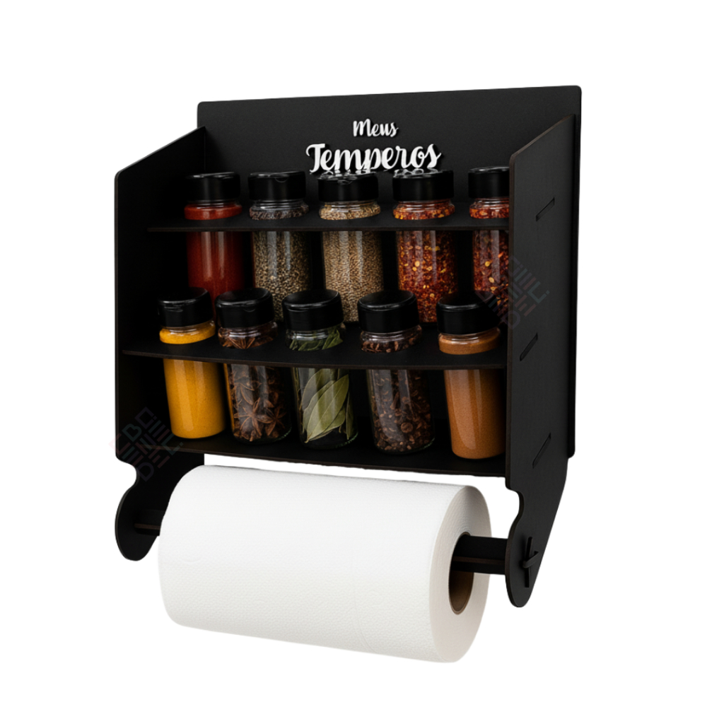 Suporte Porta Temperos MDF com 10 Potes e Porta Papel Toalha Giratório Parede Cozinha Decor Organizador Condimentos
