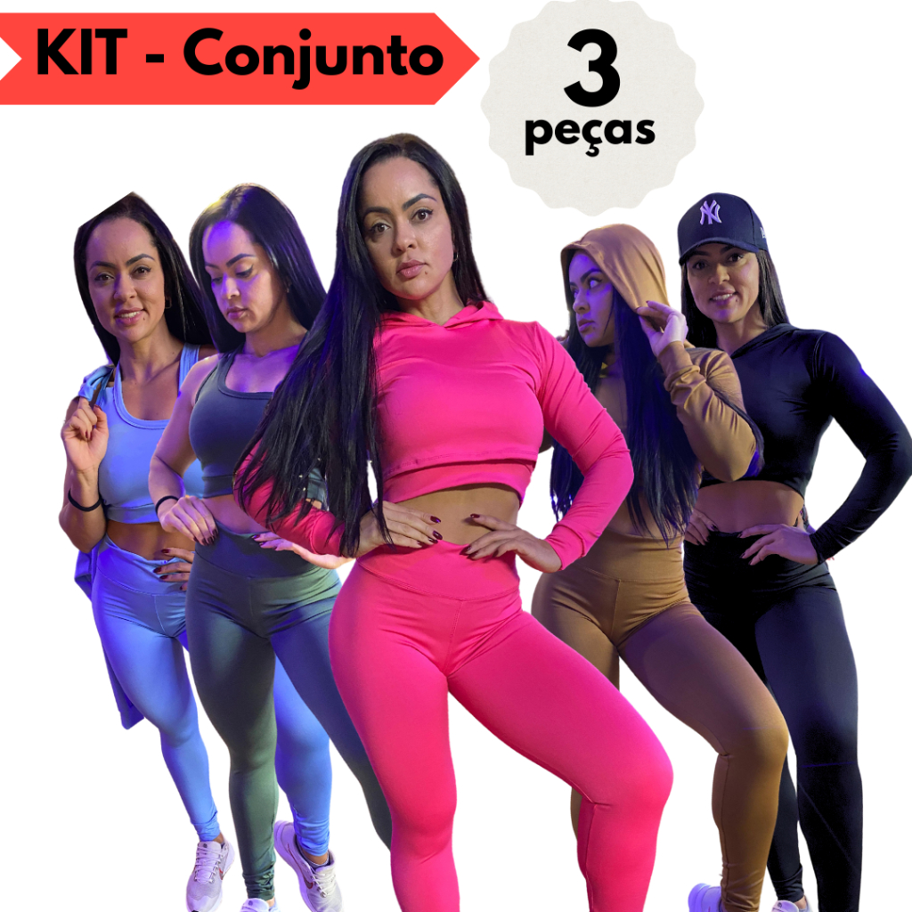 Kit Trio Conjunto Academia Top + Calça Legging Cos alto e Cropeed Manga Longa Treino