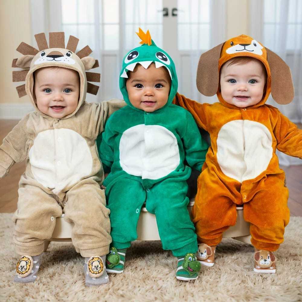 Macacão de Bebê Dino Plush Com Capuz + Pantufa Dinossauro leão Vaquinha Cachorrinho