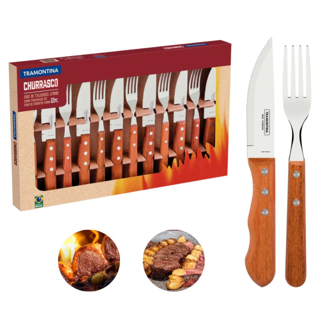 Faqueiro Jogo De Talheres Inox Tramontina Jumbo para Churrasco Madeira 12 Peças Garfo Faca