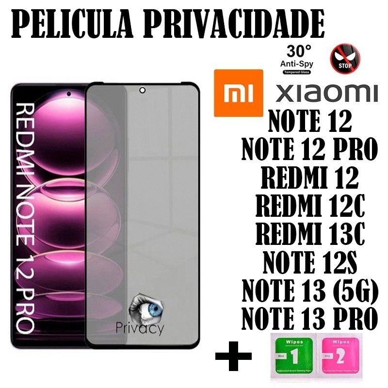 Película Privacidade de Vidro 3D Para Note 13/Note 13 Pro/13c/Note 12/Note 12 Pro/Note 12s/Redmi 12c/Redmi 12 Protegor de Tela Anti Spy