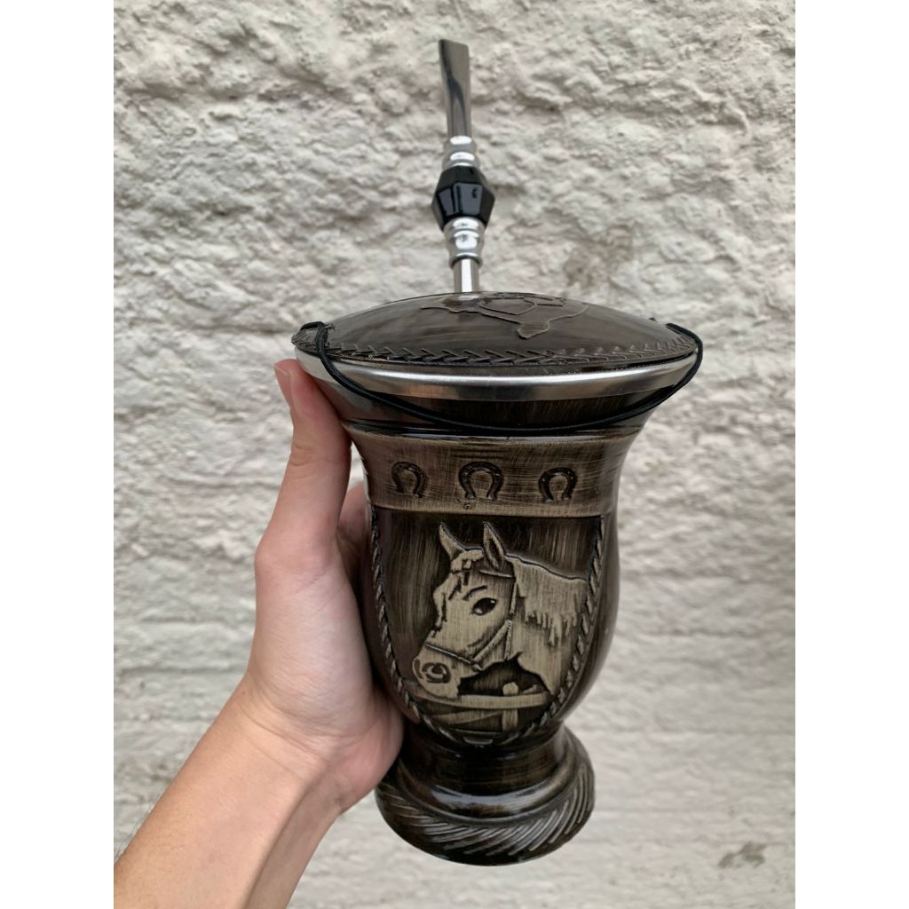 [PROMO CONTA NOVA] Kit Chimarrão: Cuia Porongo Cavalo Bocal Inox + Bomba Inox Sem Rosca