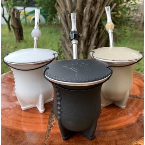 Kit chimarrão PREMIUM: Cuia de Porongo Revestida em Sintético + Bomba em inox decorada + Tapa erva + Pulseira/Choker Div