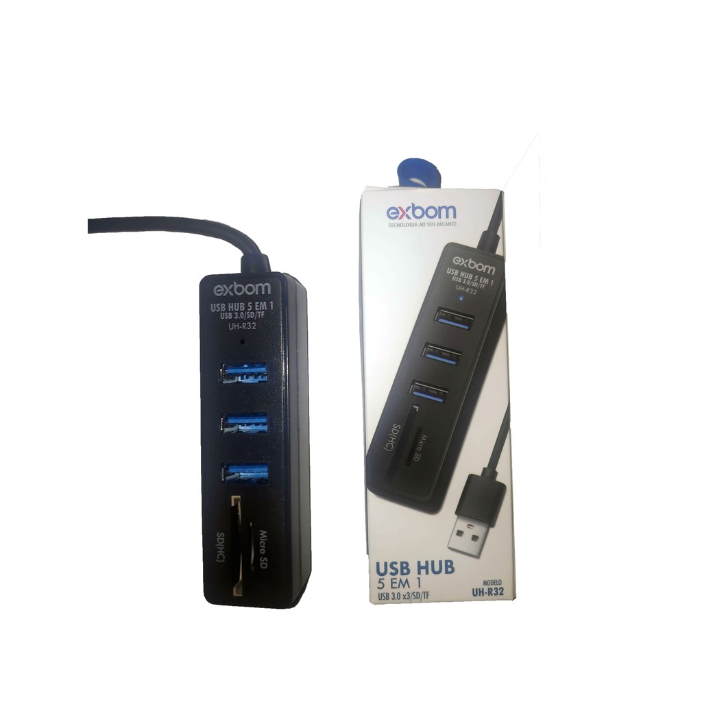 HUB USB 5 em 1 com 3, Portas USB 3.0 + Leitor de Cartão microSD + Leitor de Cartão SD Exbom - UH-R33