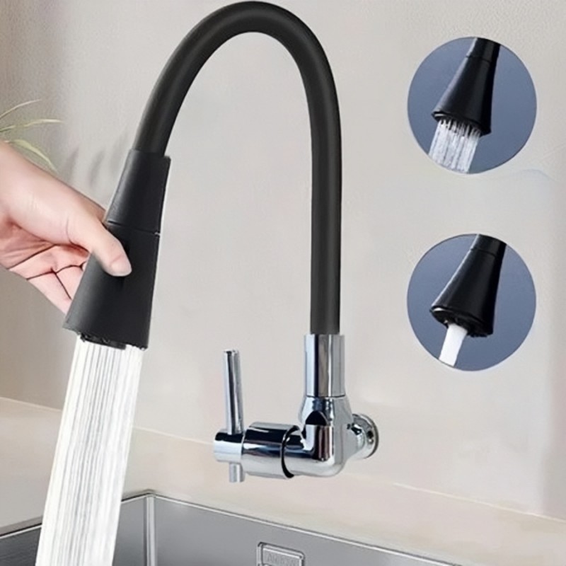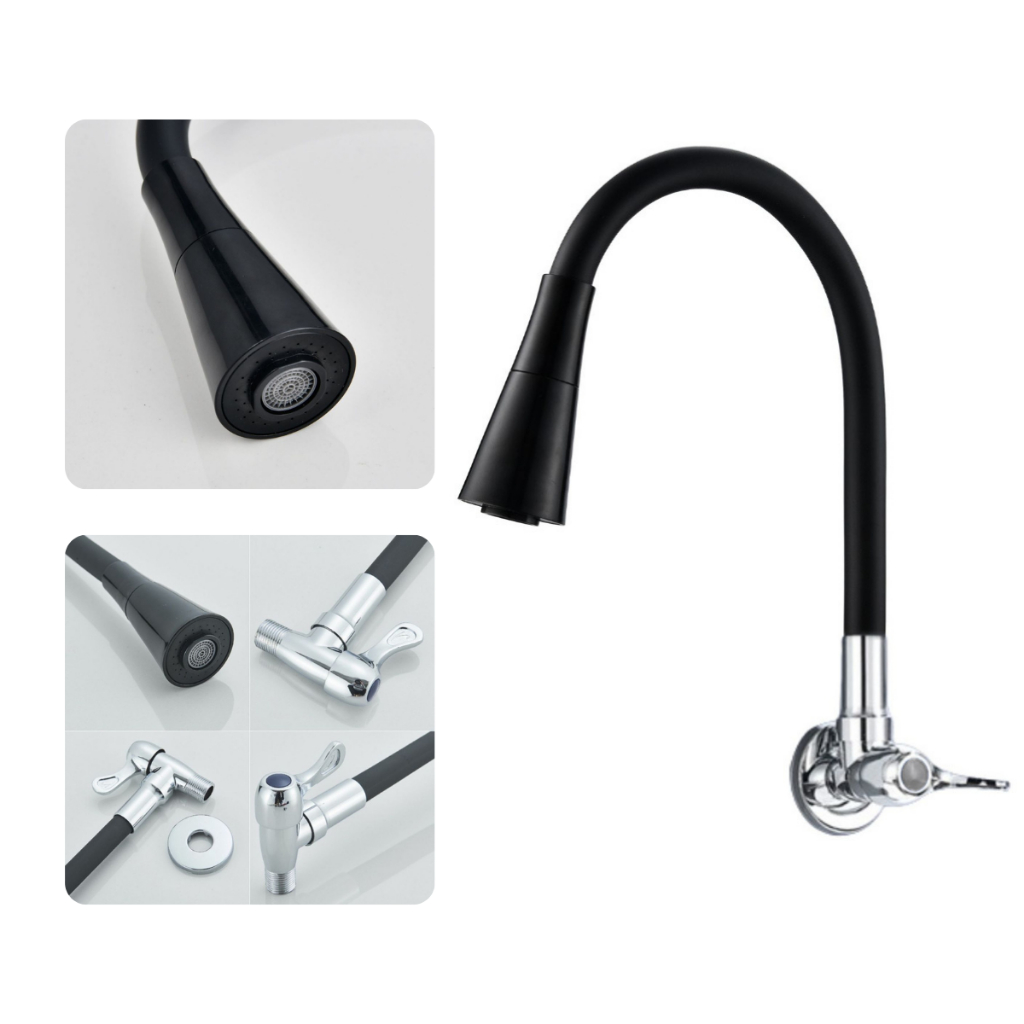 Torneira Cozinha Parede Gourmet Flexível Preta 2 Jatos Giratória Premium Encaixe de Aço Inox No Tubo