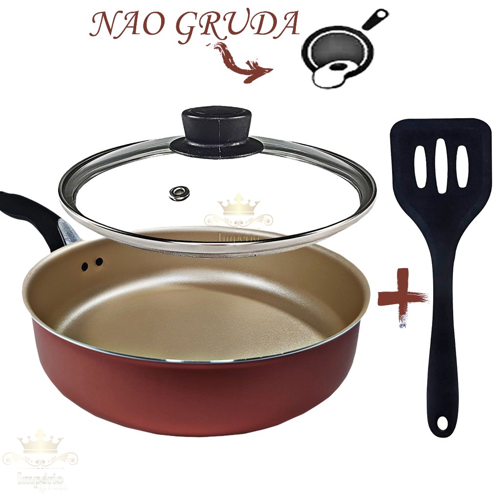 Frigideira Alta 18 Cm Com Tampa De Vidro E Espátula Antiaderente Com 5 Camadas De Teflon Cor Cereja Gold Frigideira Grande Funda Alumínio Resistente