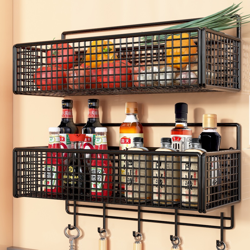 KIT 2 Organizador Prateleira De Cozinha Banheiro Preto Prateleira De Armazenamento Minimalista De Ferro Para Temperos E Alho Montada Na Parede Com Cesto De Drenagem Para Armazenamento De Banheiro