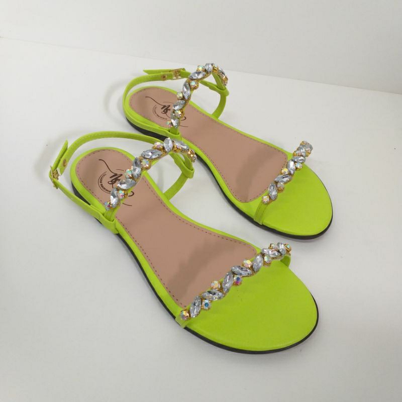 Sandália Feminina Pedraria Strass Luxo - Preta e Verde Neon - Rasteirinha Brilho Conforto - S'Fram Calçados