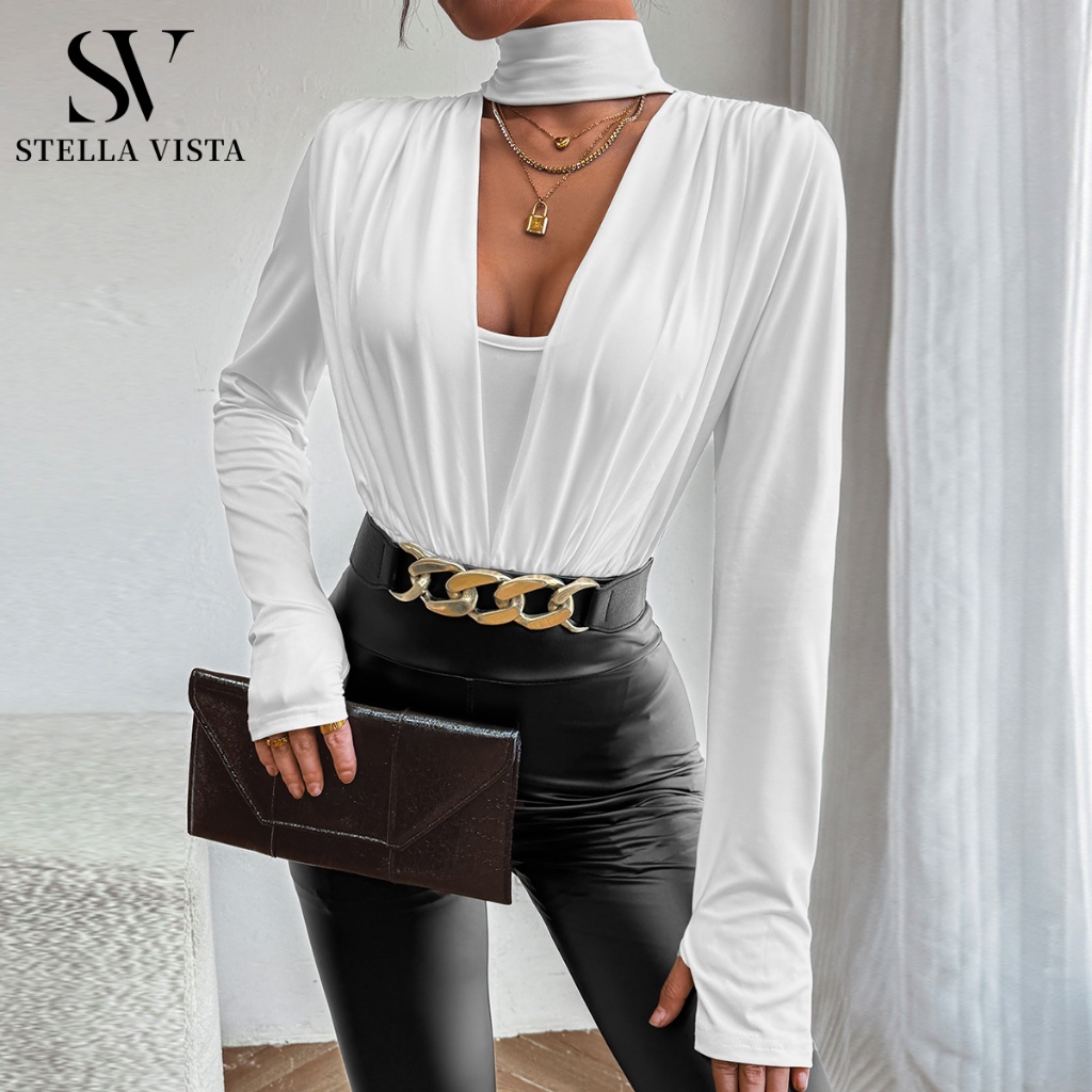 SV macaquinho Branco Feminino Elegante de Manga Longa, com decote em V e design de pregas no peito