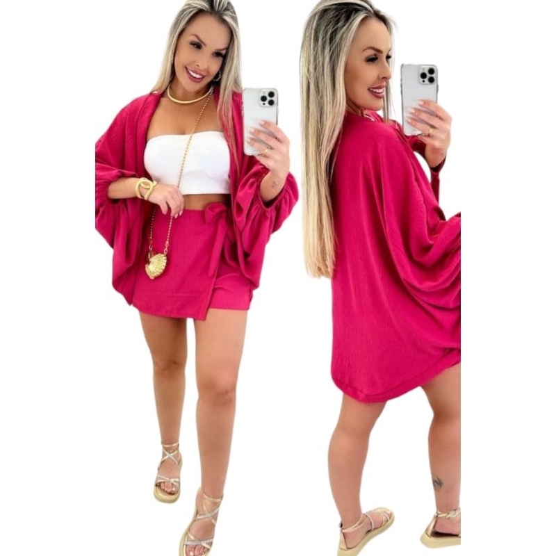 Conjunto short saia + kimono feminino tendência moda blogueira Max camisa cardigã