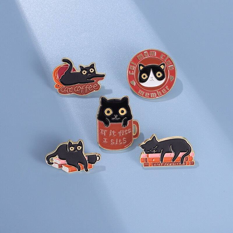 Desenho Animado Fofo Gato Preto Esmalte Adormecido Broche De Café Animal Mamãe Clube Gatinho Lapela Alfinetes Crachá Jóias Acessórios Presente