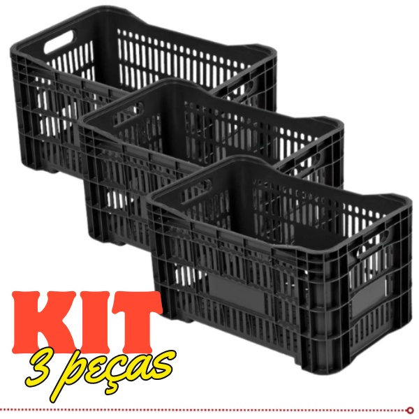 KIT 3 Caixas Agrícola Hortifrúti Organizadora Plástica 50 Litros com alça e Ombreira