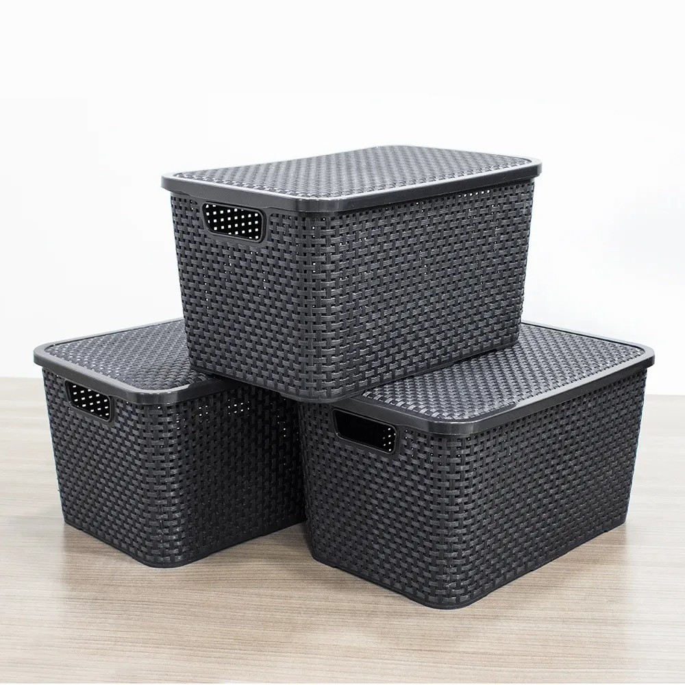 Kit 3 Caixas Organizadoras 20 Litros, 15 Litros e 7 Litros Cesto Multiuso Rattan Com Tampa Preto Empilhavel Brinquedos Roupas Livros Caixa Organizadora