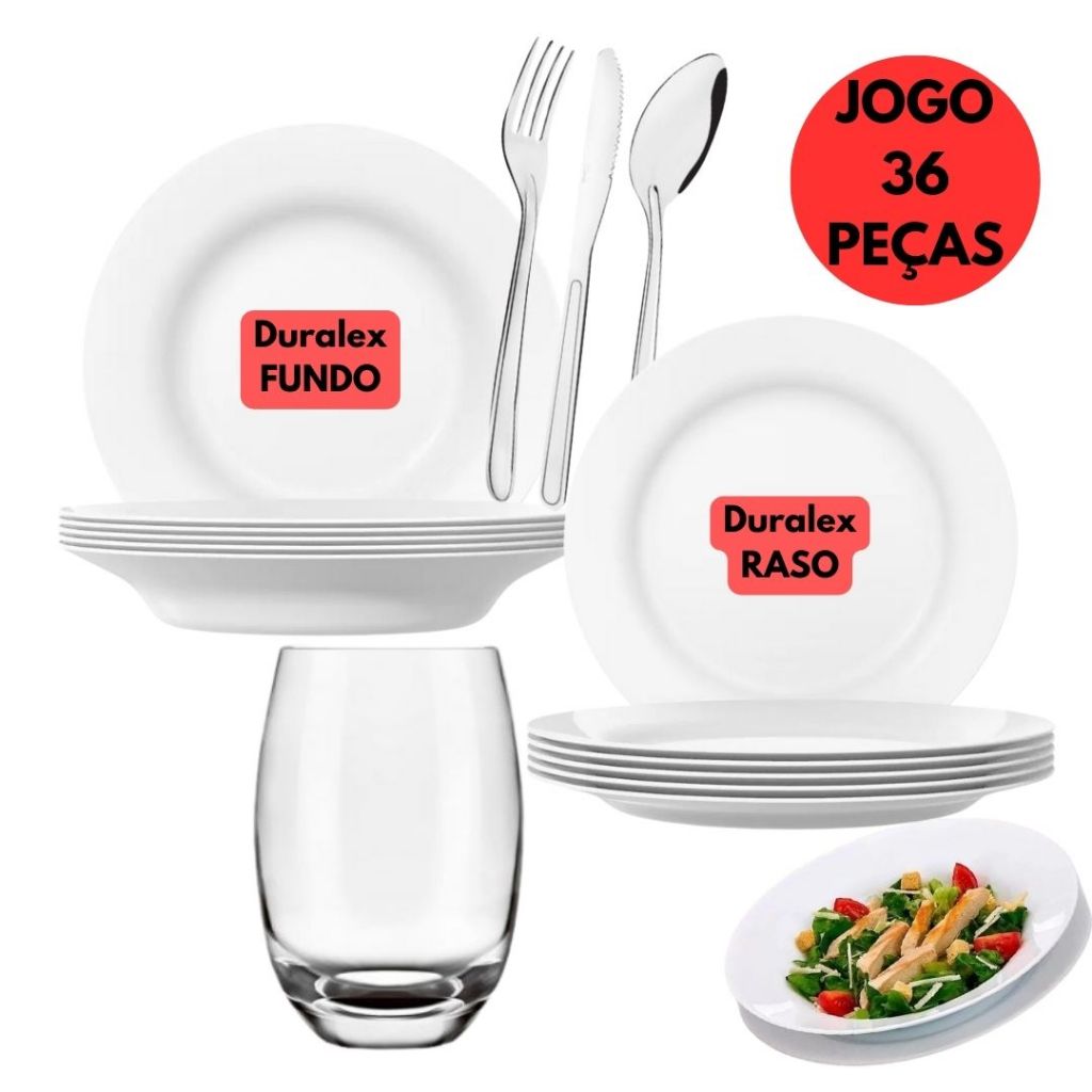Jogo Aparelho Jantar 36 Peças C/ 06 Prato Duralex Vidro Fundo+ 06 Raso Menu +06 Copos +18 Talheres Inox Oriente Resistente