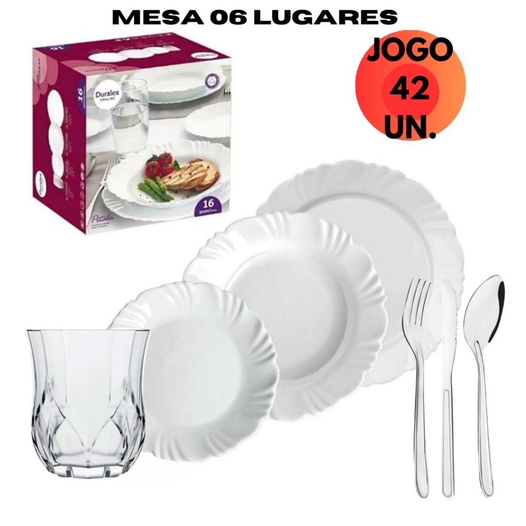 Kit Aparelho 42Un. Jantar C/ 06 Prato Vidro Duralex Fundo Petala+ 06 raso +06 Sobremesa +06 Copo Opera 330ML+ 18 Talheres Oriente Aço Inox