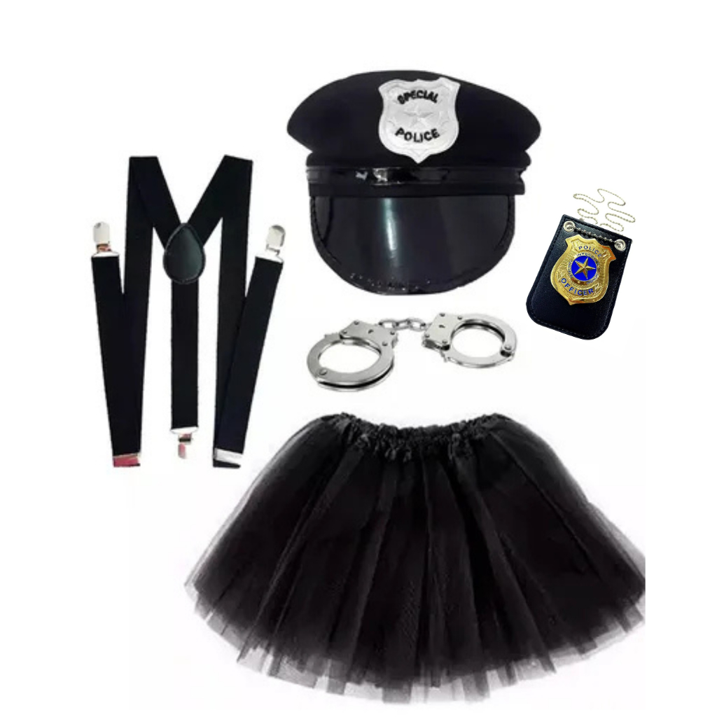 Fantasia Policial Militar Completa com Quepe Preto Algema Suspensório e Saia de Tule- Festa Carnaval