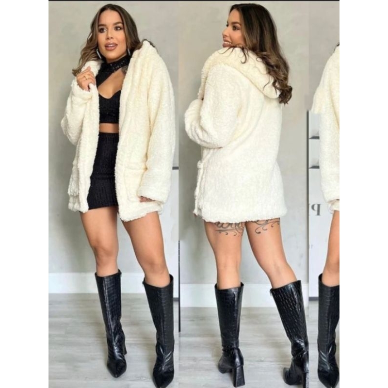 CASACO DE PELINHOS SOBRETUDO FORRADO COM BOLSO E CAPUZ TEDDY MARROM TENDÊNCIA PRO FRIO DO INVERNO MODA BRASILEÑA