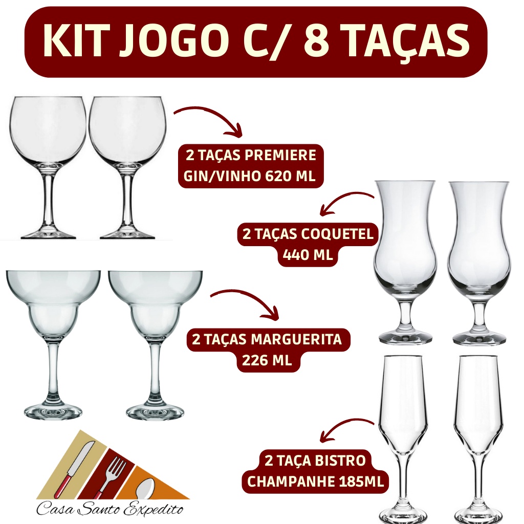 Conjunto Kit 8 Pçs C/ 2 Taça de Vidro Premiere Gin Vinho 2 Coquetel 2 Marguerita 2 Champagne Envio Imediato