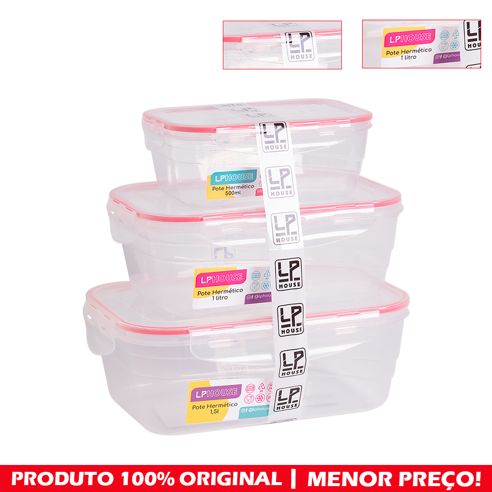 Kit 3 Potes Hermético 500ml/1L/1,5L , Plástico Resistente Tampa Trava Silicone Marmita Geladeira Microondas Freezer