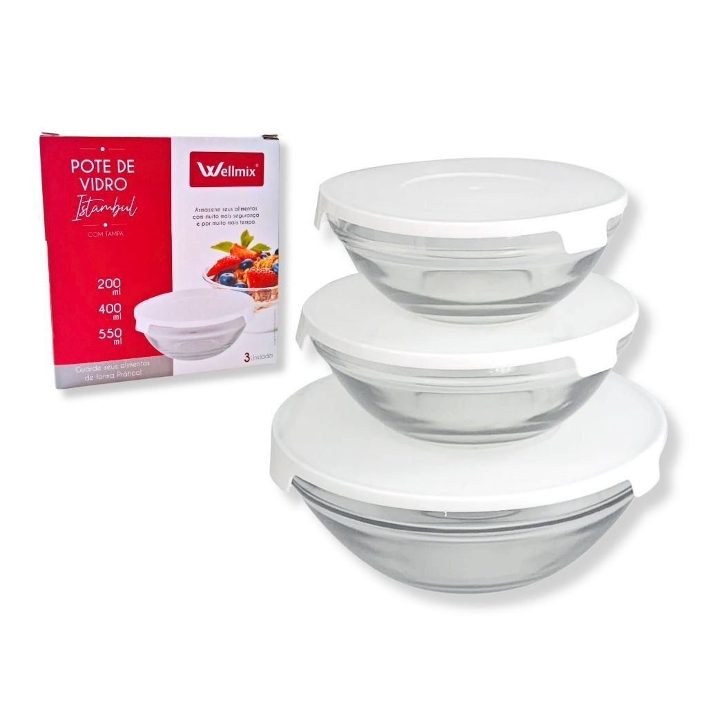 Conjunto 3 Potes Tigela De Vidro 200ml 400ml 550ml Tampa e Trava Branca De Plástico Armazenar Comida Geladeira Salada