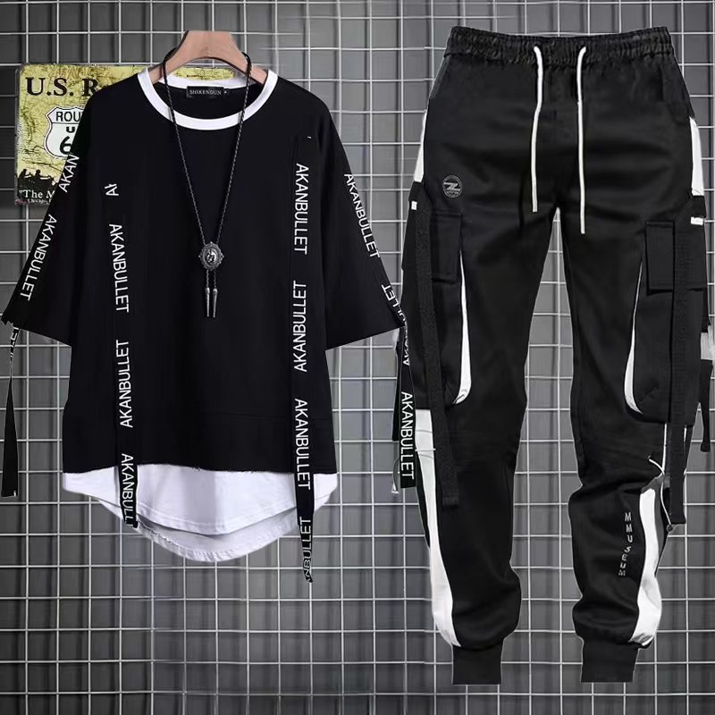 Calça De Carga Masculina Estilo Hip Hop Joggers + Conjunto De Homens Com Camiseta Casual Manga Curta
