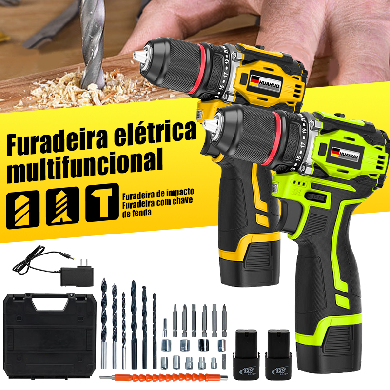 Parafusadeira Furadeira Chave de Fenda Elétrica Kit 23 Peças Portátil Sem Fio 2 Baterias v12 voltz 1300mAh Com Maleta
