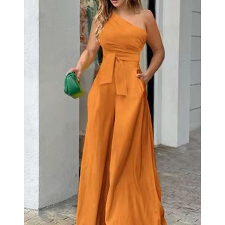 Novo Verão 2023 Elegante Macacão De Bolso De Poliéster Liso Amarrado Detalhe Regular Trabalho Diário Um Ombro Sem Mangas De Perna Larga