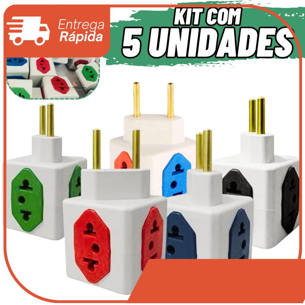 Adaptador de Tomada Kit com 5 Benjamim CUBO 10A/20A 4 Tomadas Colorida