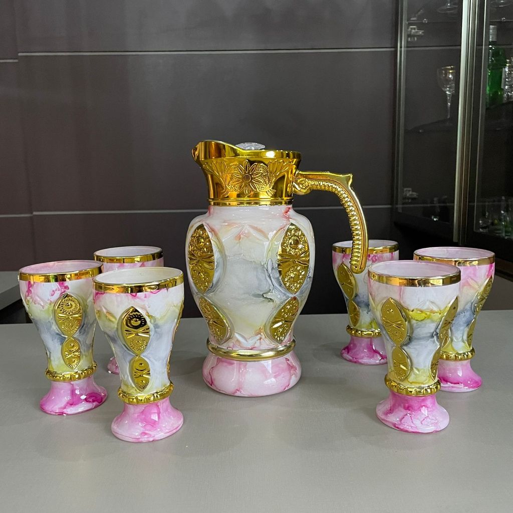 conjunto de 6 taças de vidro com detalhes em dourado com jarra com tampa