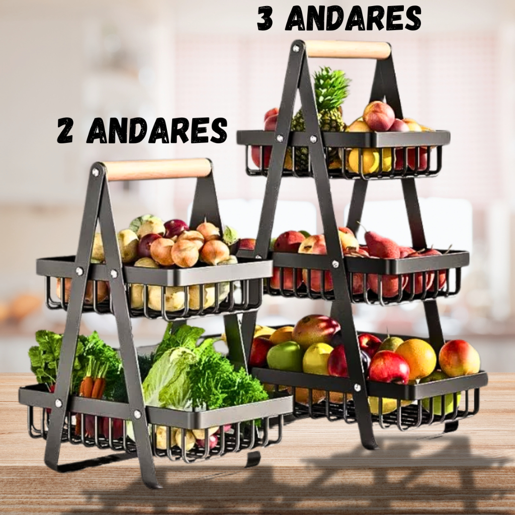 Fruteira de Chão Mesa Tripla Aramada Cesto Organizador de Frutas Metal Madeira Cozinha 2 e 3 Andares