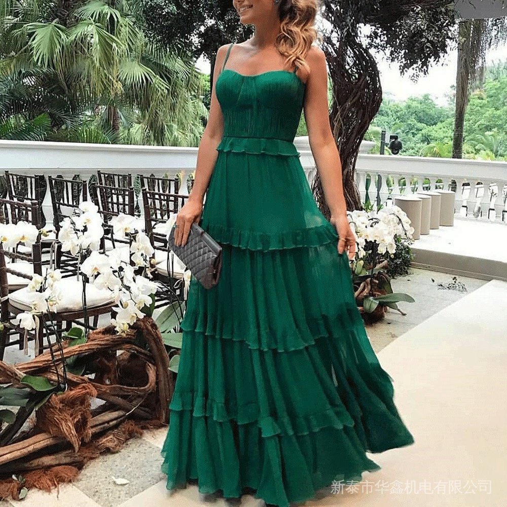 Vestido De Festa De Noite Tule Verde Com Alça De Espaguete Elegante Sem Mangas Sexy Longo Plissado Babados Maxi De Verão