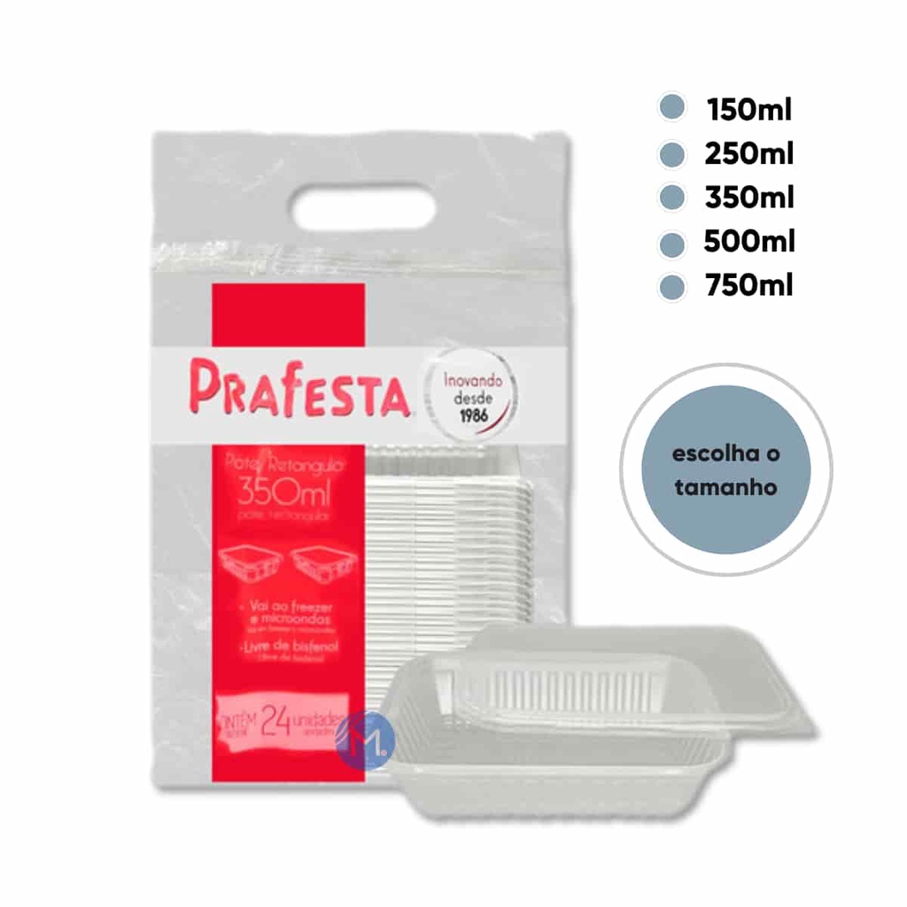 Kit com 24 Potes retangular marmita fit descartável plástico microondas freezer 150ml, 250ml, 350ml, 500ml, 750ml com tampa PraFesta