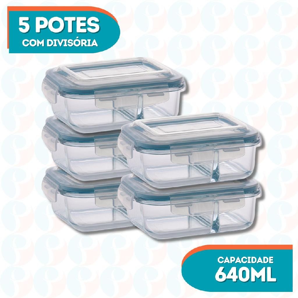 Kit 5 Pote de Vidro Hermético Com Divisoria 640ml Marmita
