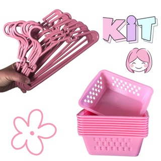 Cesto Organizador e Cabide infantil Kit 10 Cestinhas e 20 Cabides Rosa Para Bebe