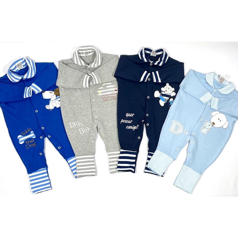 Kit C/4 - Macacão de Bebe Suedine Vira Pé Bordado Menino