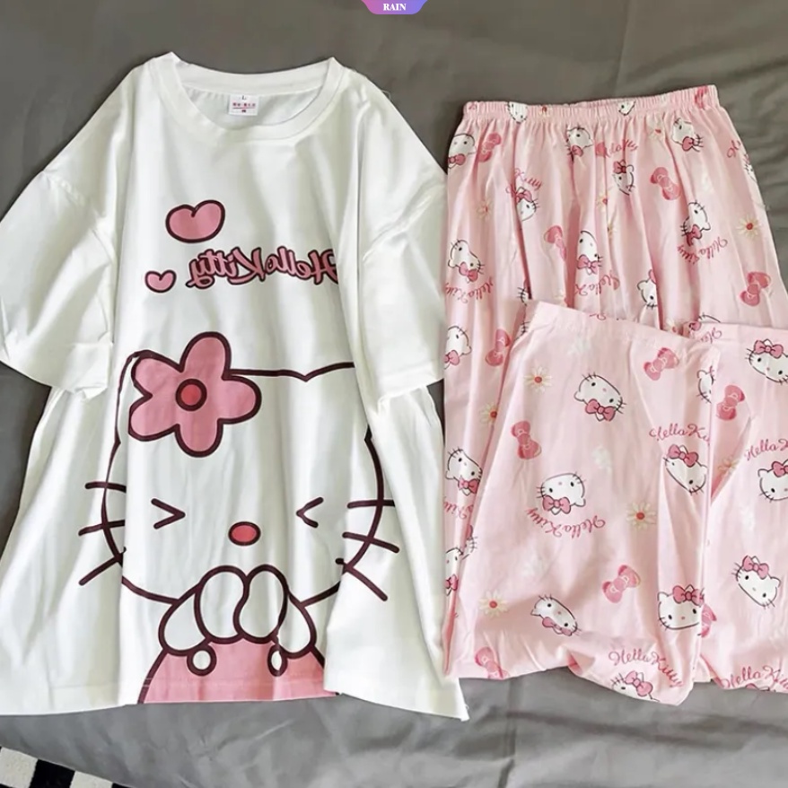 Novo Desenho Animado Anime Sanrio Hello Kitty Padrões Impressos Femininos Pijama Fino De Verão Conjuntos Kawaii Cutel Girl Student Loose Short-sleeved Top + Calças Longas Conjunto De Duas Peças [RAIN]