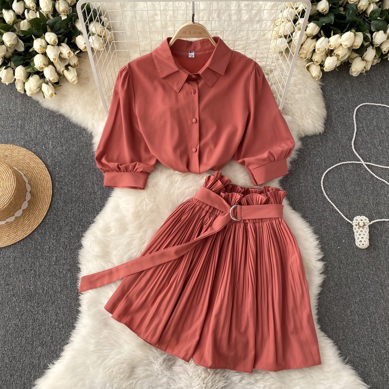 Fatos De Moda Sólida Vintage Sexy Verão Lapela Manga De Bolha De Pescoço Camisas De Peito Simples + Saias De Cintura Alta Pregueada Linha A Conjuntos De Duas Peças