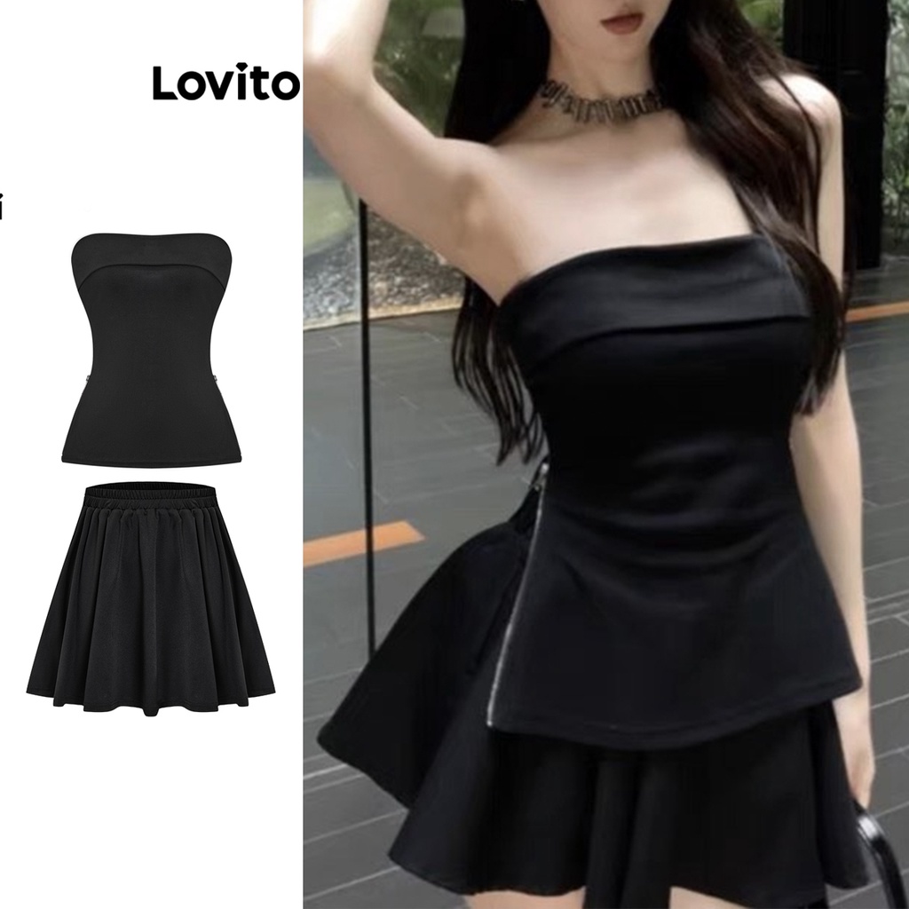 Lovito Casual Com Zíper Liso De Duas Peças Para Mulheres L70AD040 (Topo/Saia/Conjuntos)