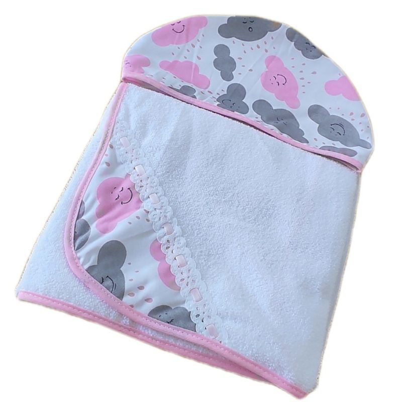 Toalha De Banho Bebe Dupla Face Com Capuz Forrada com fralda Céu Rosa