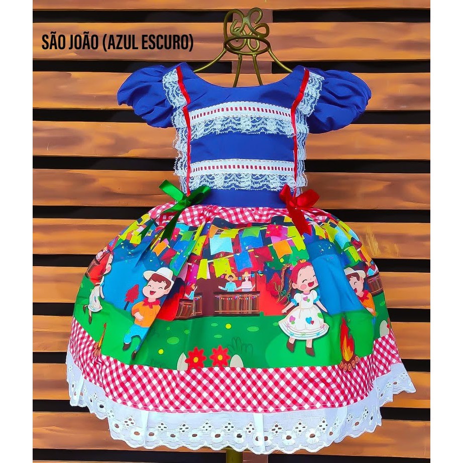 Vestido Luxo Temático Infantil Festa Junina São João Junina Arraiá ( azul escuro)