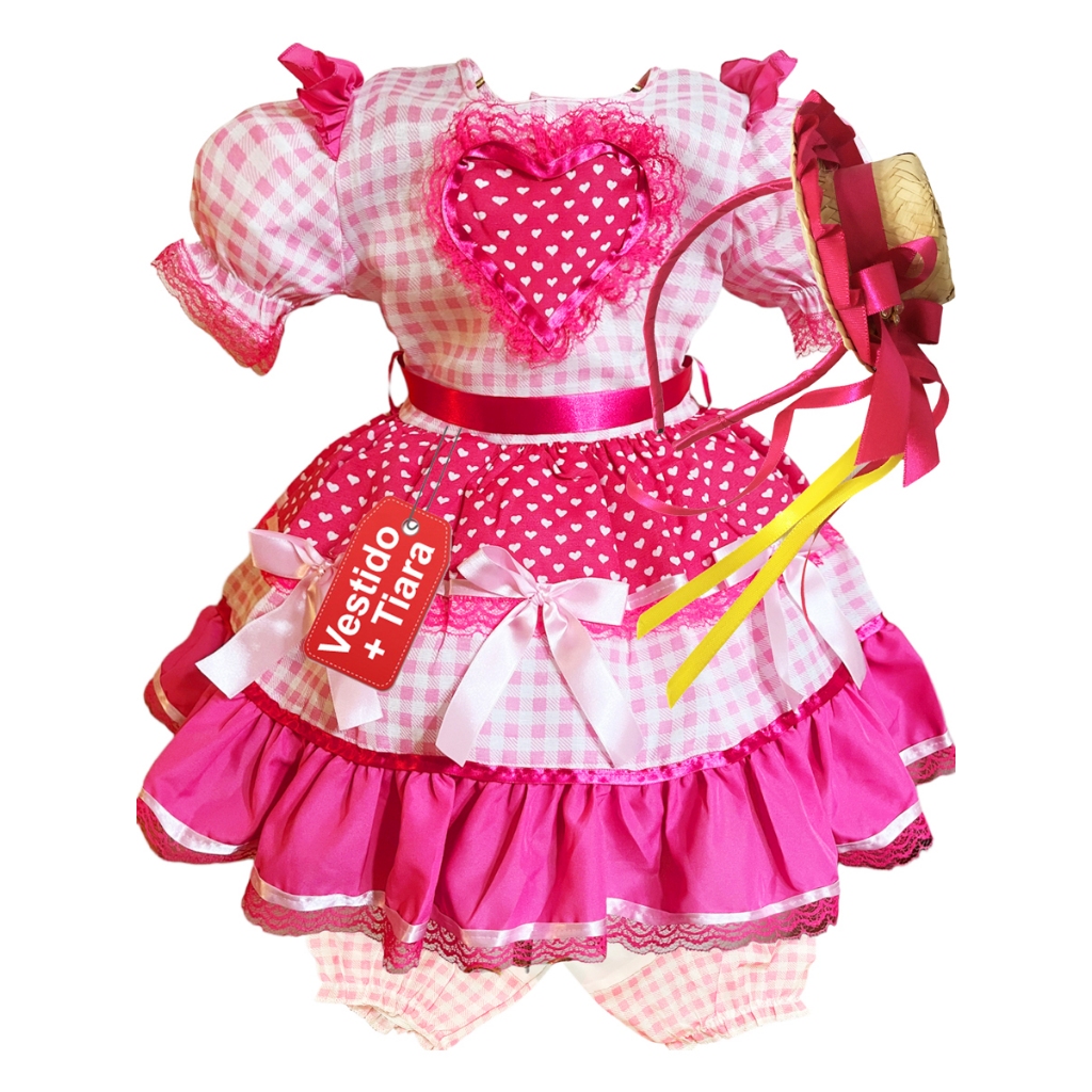 VESTIDO CAIPIRA ROSA FESTA JUNINA INFANTIL SÃO JOÃO FRESCO MODERMO TECIDO LEVE MENINA INFANTIL